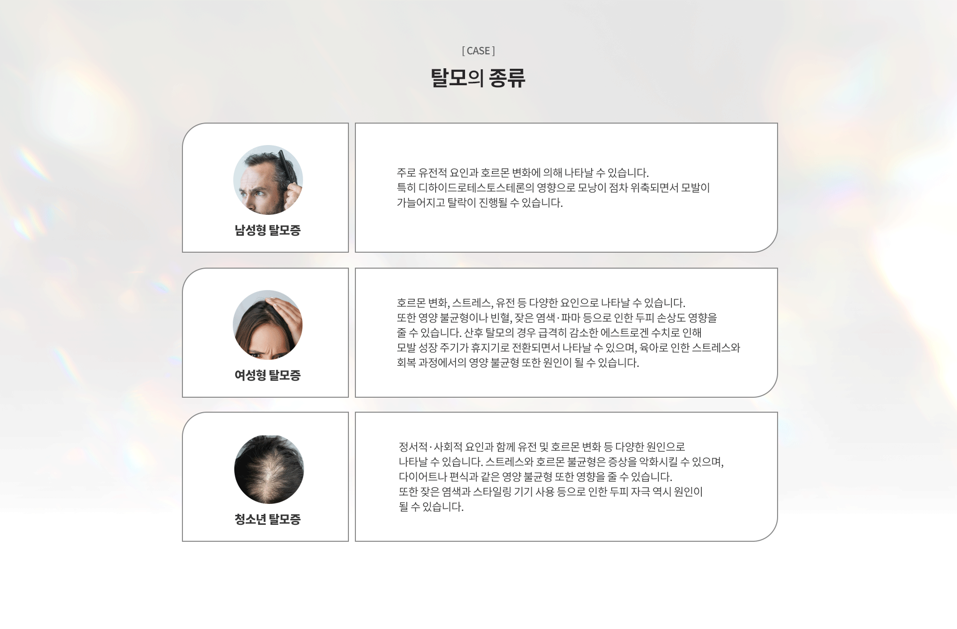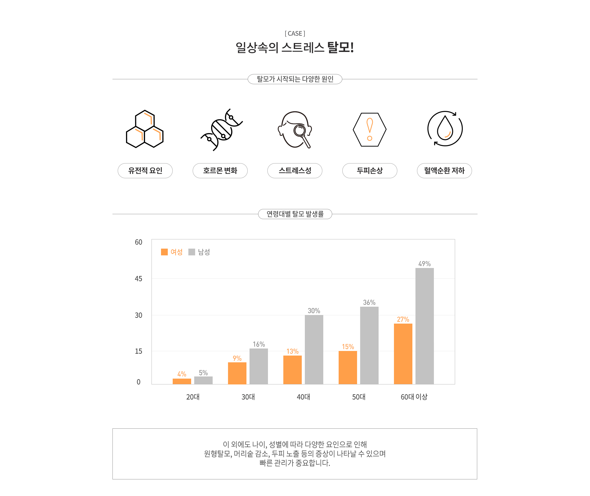 탈모는 초기 관리가 중요한 만큼, 모낭 기능이 유지되어 있는 시기에 관리할 경우 보다 효과적인 개선을 기대할 수 있습니다.
