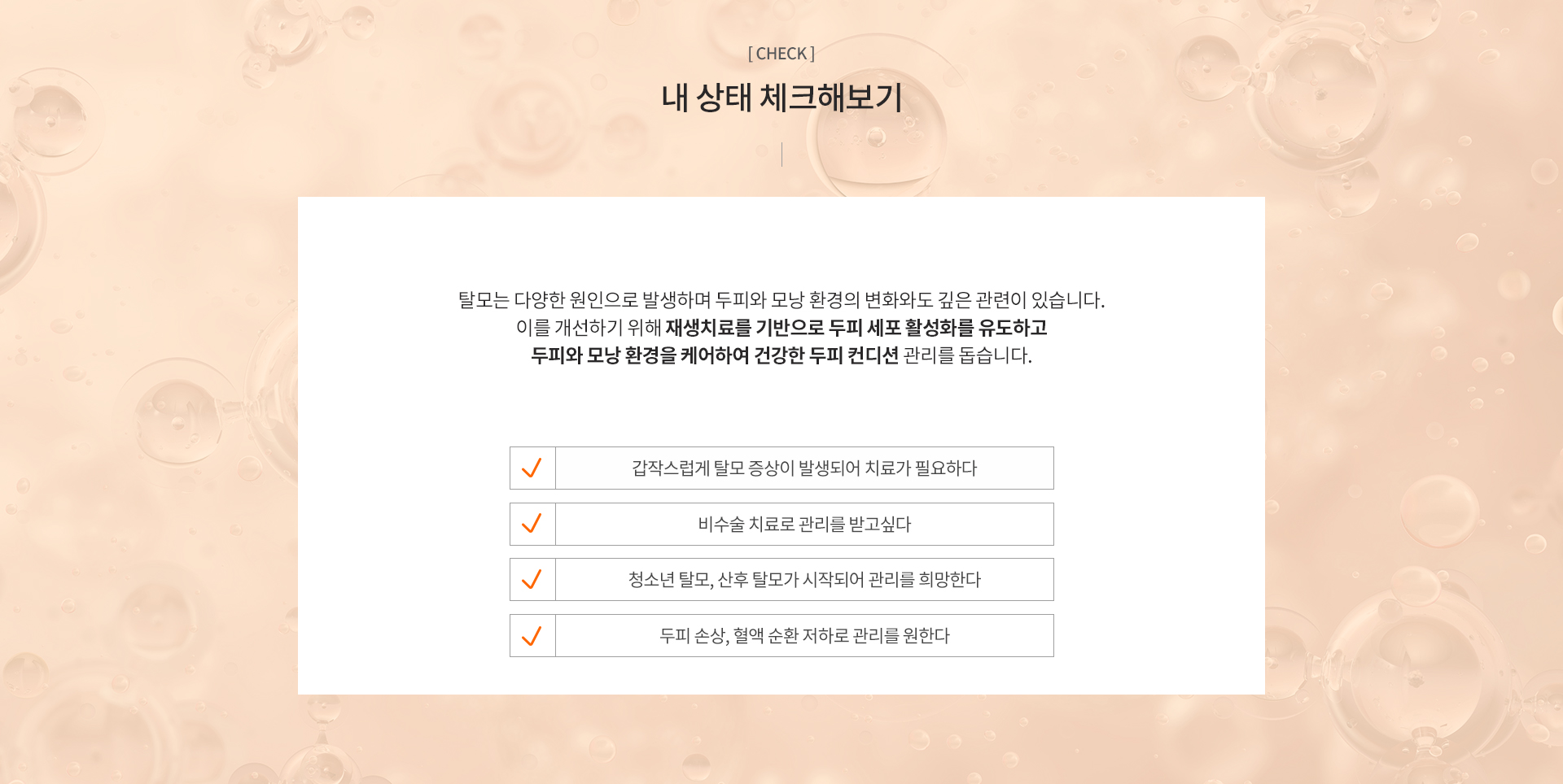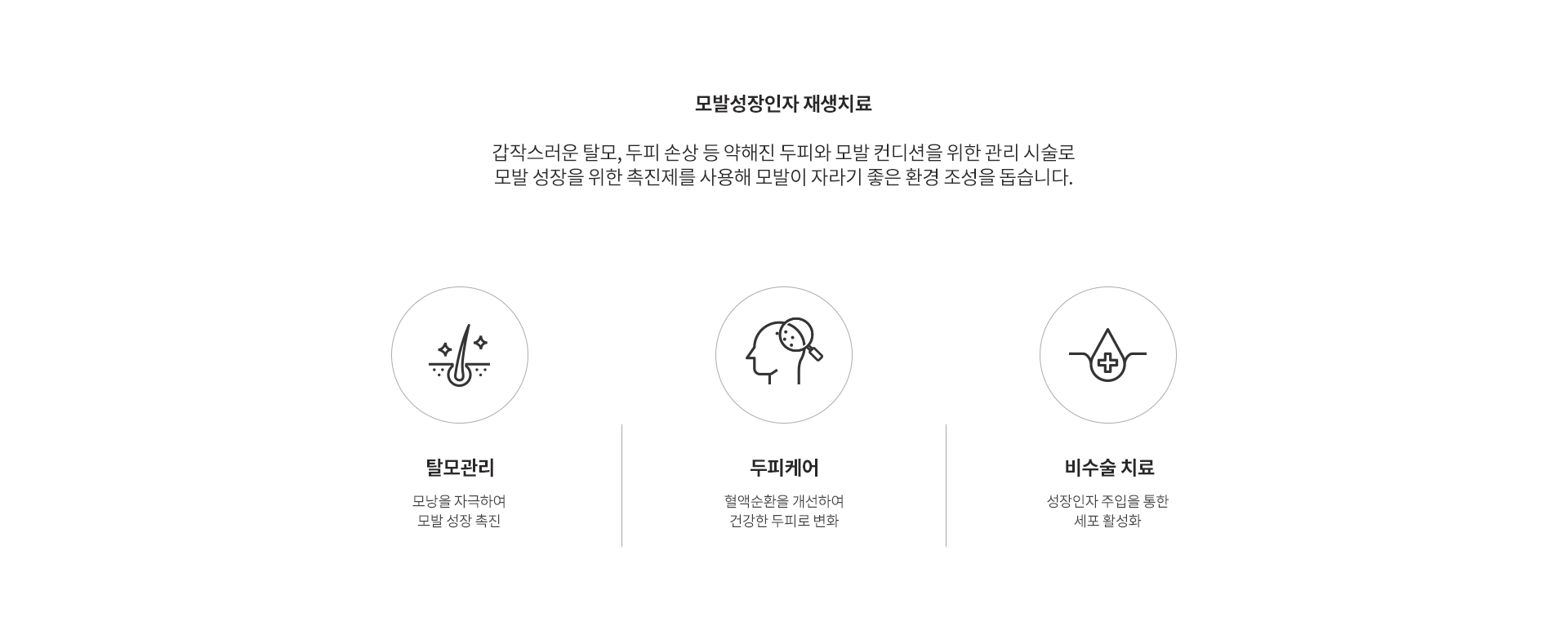 두피에 필요한 영양과 성장인자를 전달하여 모낭 환경을 개선하고, 건강한 모발 성장을 돕는 비수술적 치료입니다.
